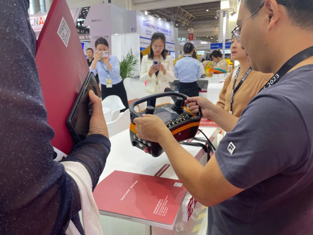 無人化也是本次展會的核心之一,在展臺另一側,多款無線?厴璞敢駁玫攪絲突У墓惴汗刈。eTelecom系列遙控系統,發射器面板可根據客戶的功能需求進行非標定制,面板可以安裝單軸?、雙軸遙控、電位計、選擇開關、撥動開關等。不僅品質可靠,并且采用符合人體力學的腰跨式設計,在工程機械、林業機械、港口機械等領域廣泛應用。